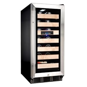 Elegantly store up to 26 standard-size bottles of wine at the proper temperature with this attractive wine cooler. Its smooth-gliding slide-out metal shelves, each with beautiful wood trim, securely cradle anything from light red or full red to white, rose, or sparkling wine and champagne. A user-friendly digital display with an adjustable thermostat make it easy to control the temperature settings. The appliance provides a locking glass door and an interior light that can be turned on to help find a specific bottle or to simply showcase the collection. Furthermore, its design includes a front-venting exhaust system, which allows it to be built in as an under-the-counter appliance or as a freestanding unit. Built-in, it takes up about the same amount of space as a kitchen trash compactor, making it an excellent size for beginning wine collectors or for keeping a smaller sampling of wines from a larger collection easily accessible. Housed in a black cabinet with a stainless-steel door handle and trim, the wine cooler measures approximately 15 by 23 by 34-1/2 inches.